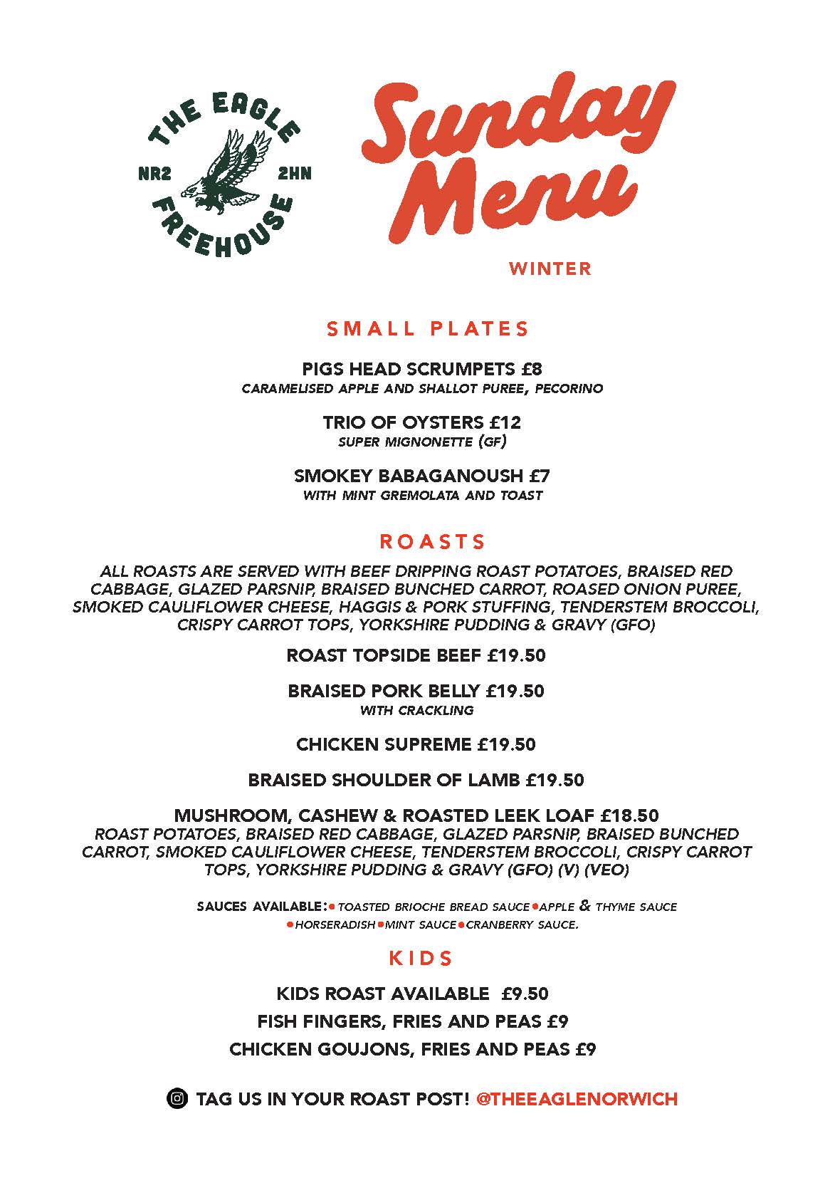 Roast sunday menu autumn:winter 2025